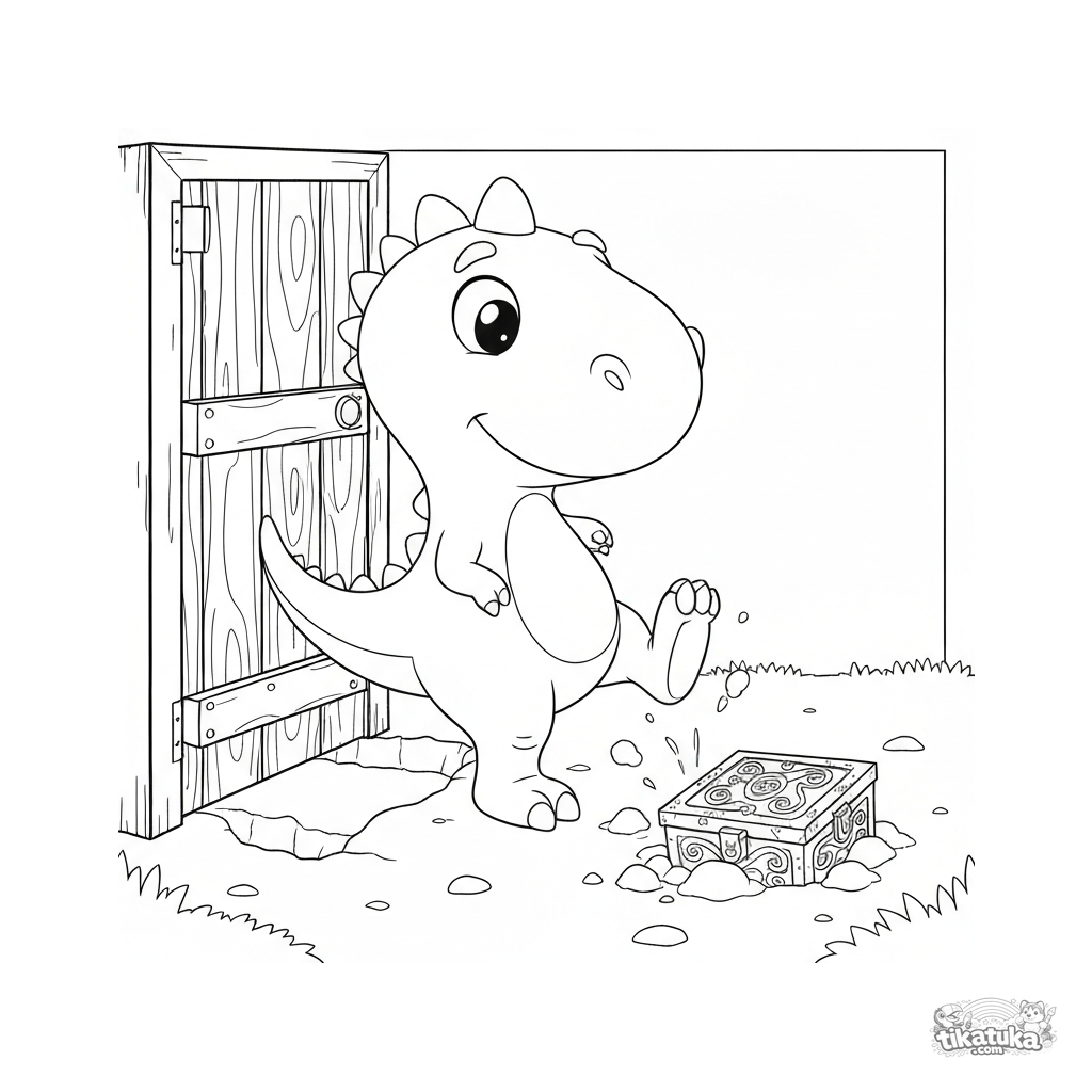 Динозавр Тоша роет землю у двери и находит старинный сундук! Скачайте, распечатайте или раскрасьте онлайн это приключение.