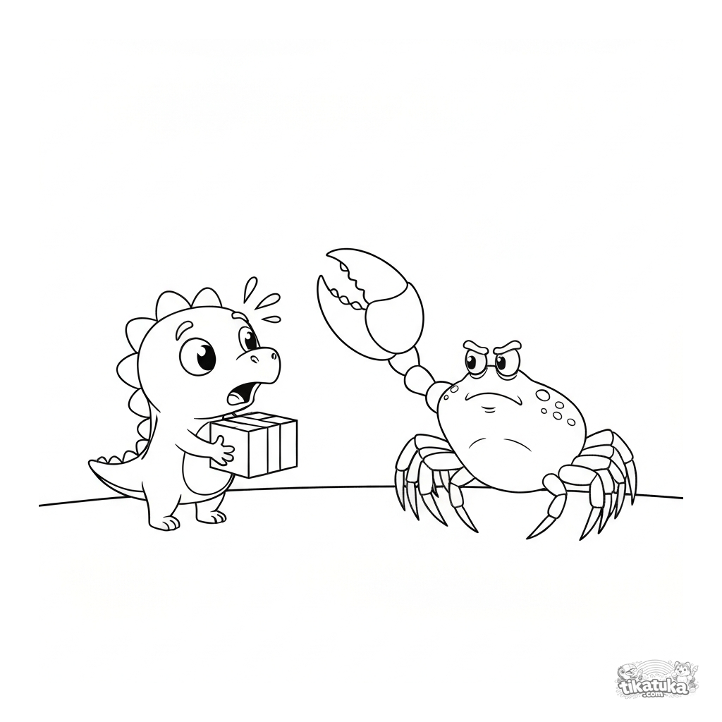 Динозавр Тоша встретил сердитого краба, который преградил ему путь и требует коробку. Скачай, распечатай или раскрась онлайн.