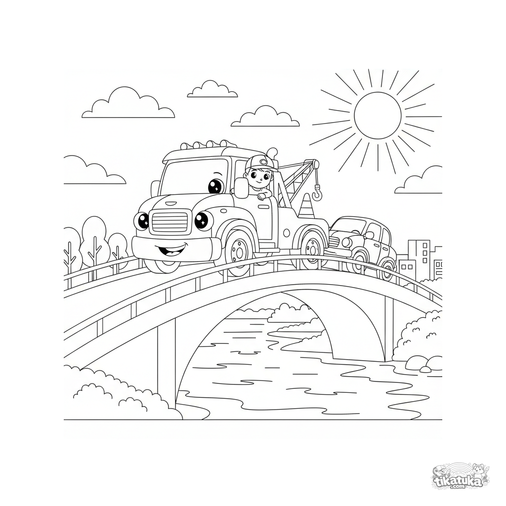 Раскраска для детей 4-6 лет: добрый эвакуатор тянет сломанную машину по мосту над большой рекой. Простые формы и понятная сцена для маленьких художников.
