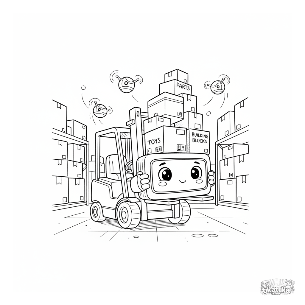 Раскраска для детей 4-6 лет: робот-погрузчик аккуратно строит башню из коробок в оживлённом складе, мимо летают дроны. Чёткие контуры, простые формы.