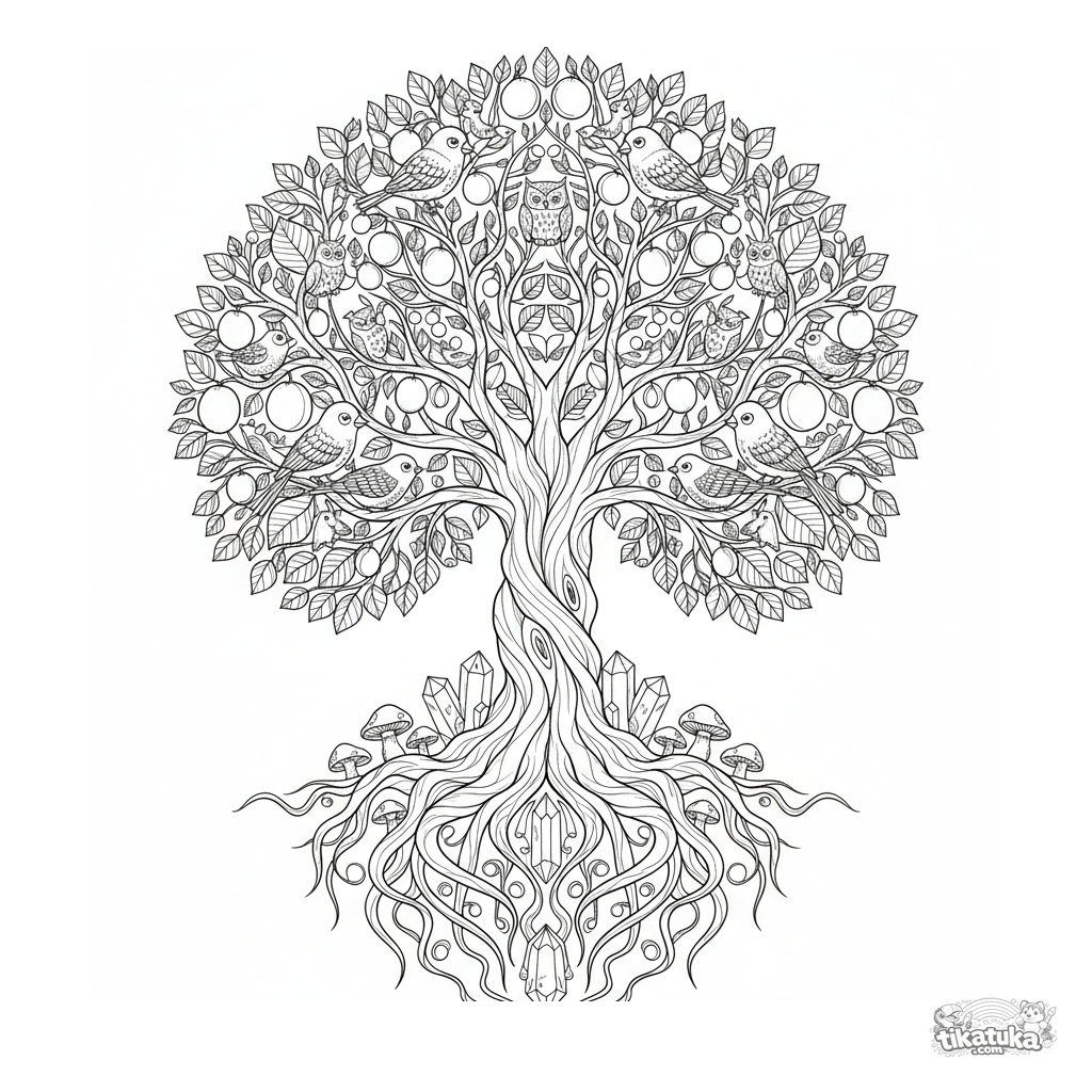 Сложная мандала в виде Древа Жизни с ветвями, листьями, птицами и животными. Детализированный симметричный рисунок для детей 10-12 лет.
