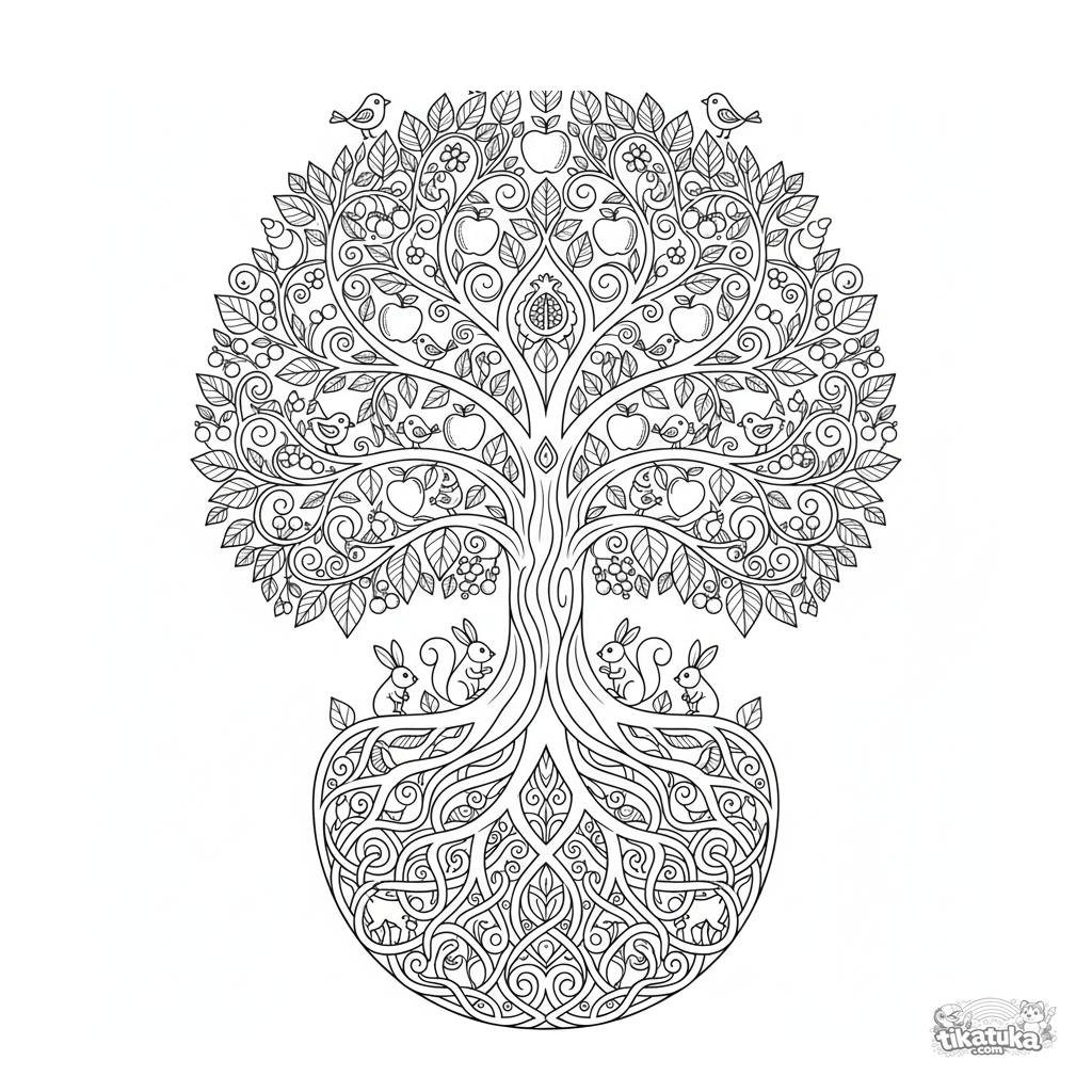 Символическая мандала Древо Жизни для раскрашивания детьми 10-12 лет. Центральный ствол, ветви с листьями и птицами, зеркальные корни, животные, детальный вертикально-симметричный дизайн.