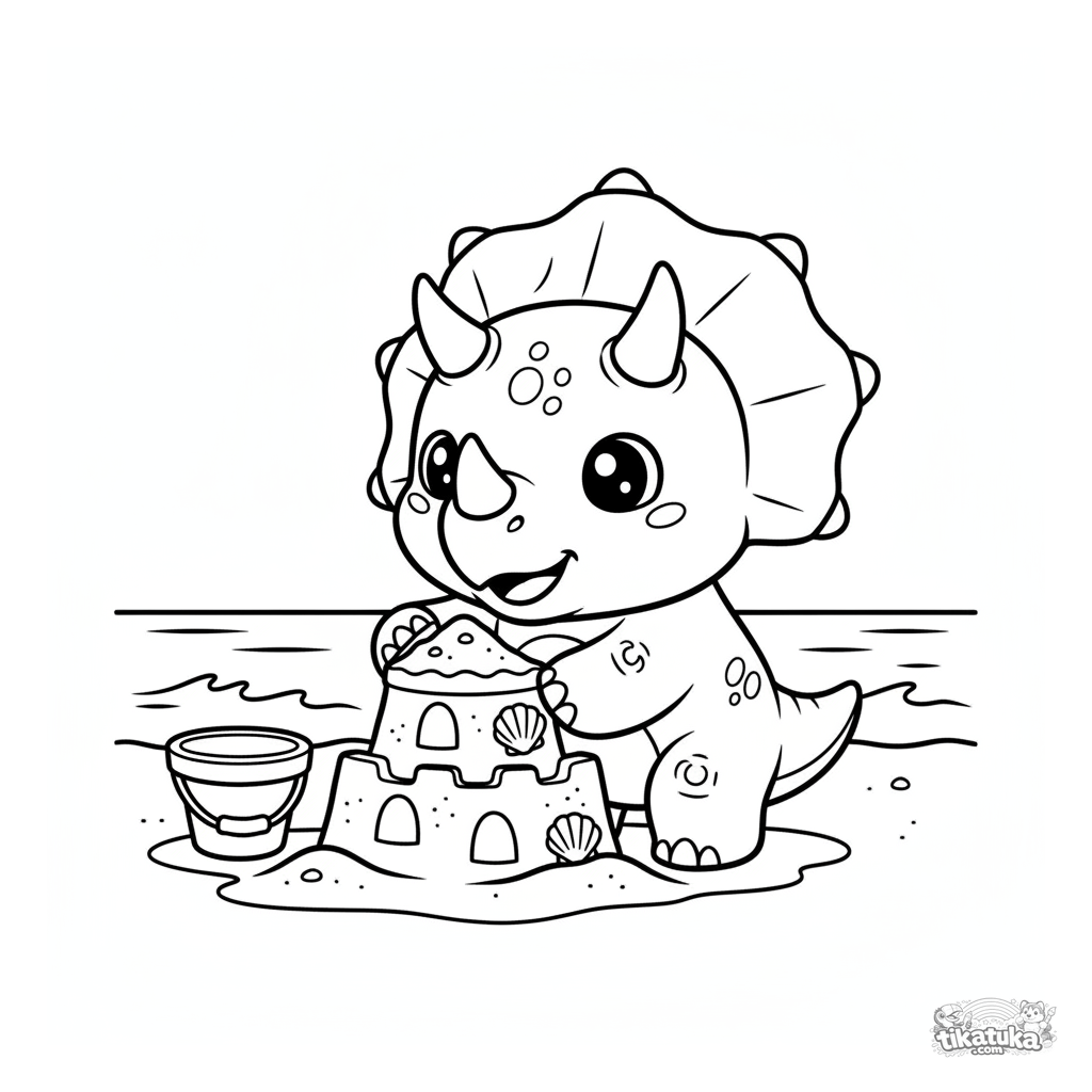 Раскраска для детей 4-6 лет: милый трицератопс в стиле чиби строит замок из песка на берегу древнего океана. Забавная и понятная сцена.