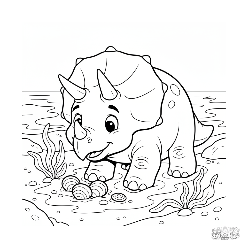 Раскраска для детей 7-9 лет: трицератопс с тремя рогами и воротником копает мокрый песок на берегу древнего океана в поисках ракушек. Выразительная поза, умеренная детализация.