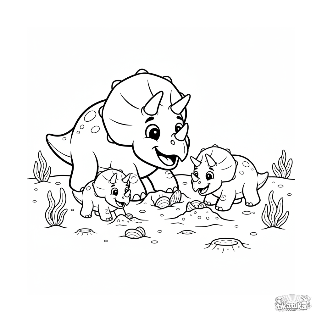Раскраска для детей 7-9 лет: семья трицератопсов ищет моллюсков на песчаном пляже древнего океана во время отлива. Динамичная семейная сцена, полные тела.