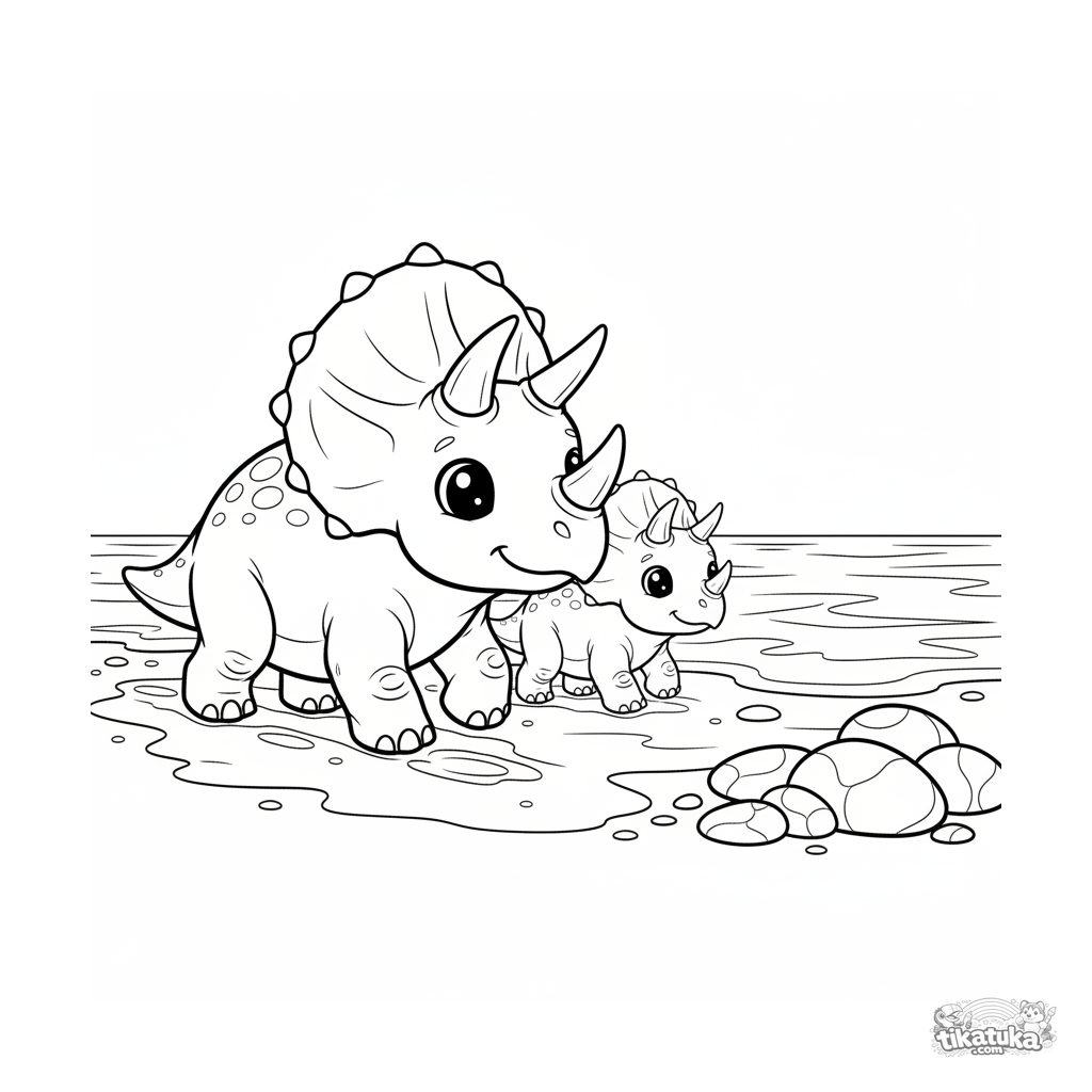 Раскраска для детей 4-6 лет: семья трицератопсов неспешно прогуливается по берегу древнего океана. Тёплая семейная сцена в классическом мультяшном стиле.