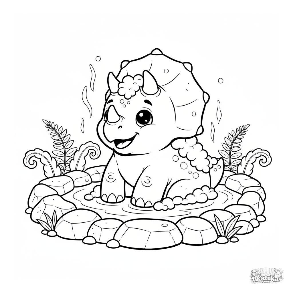 Раскраска для детей 4-6 лет: довольный трицератопс принимает пенную ванну в вулканическом источнике среди папоротников и камней.