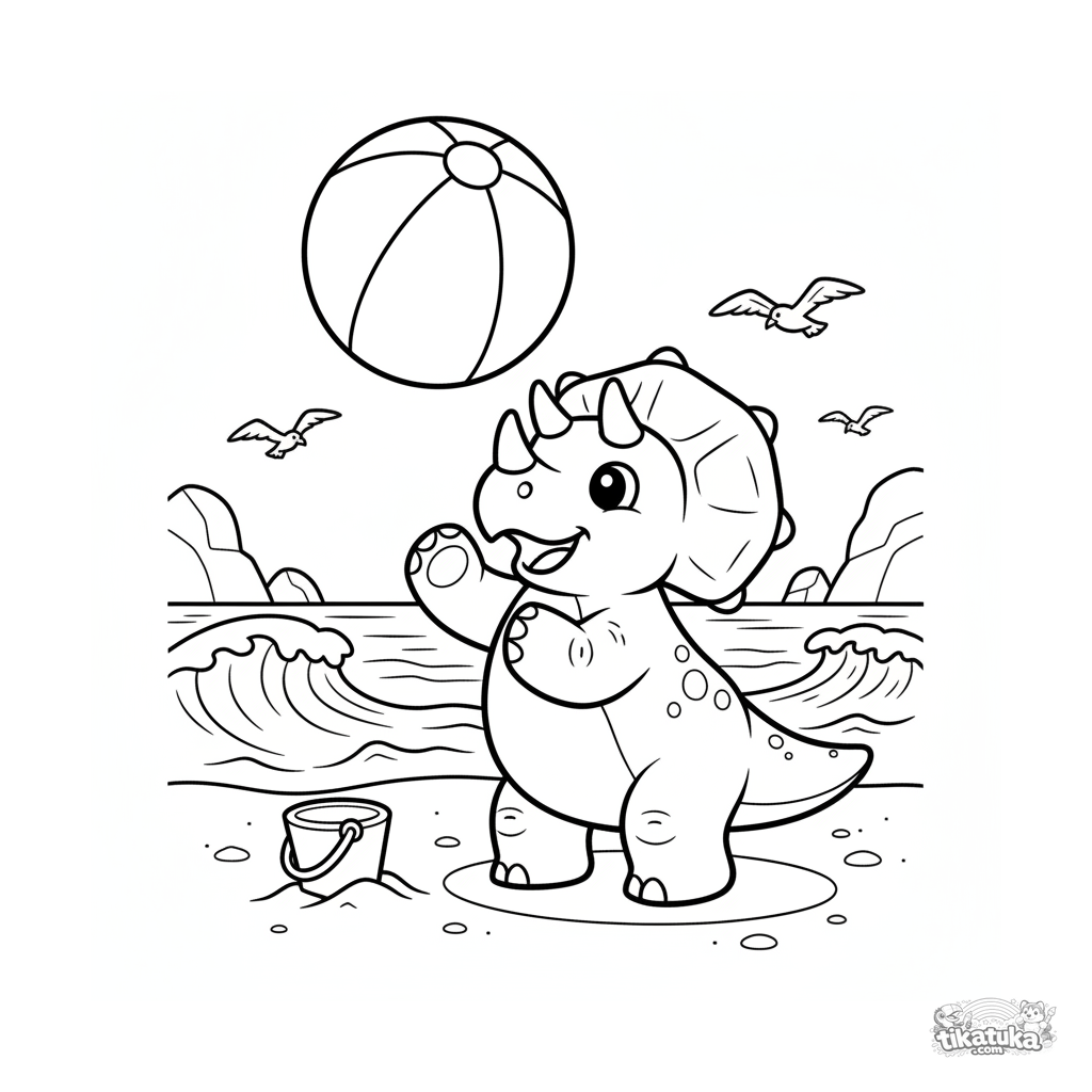 Весёлая раскраска для детей 4-6 лет: дружелюбный трицератопс играет с большим пляжным мячом на песке древнего океана. Яркая и простая сцена для раскрашивания.