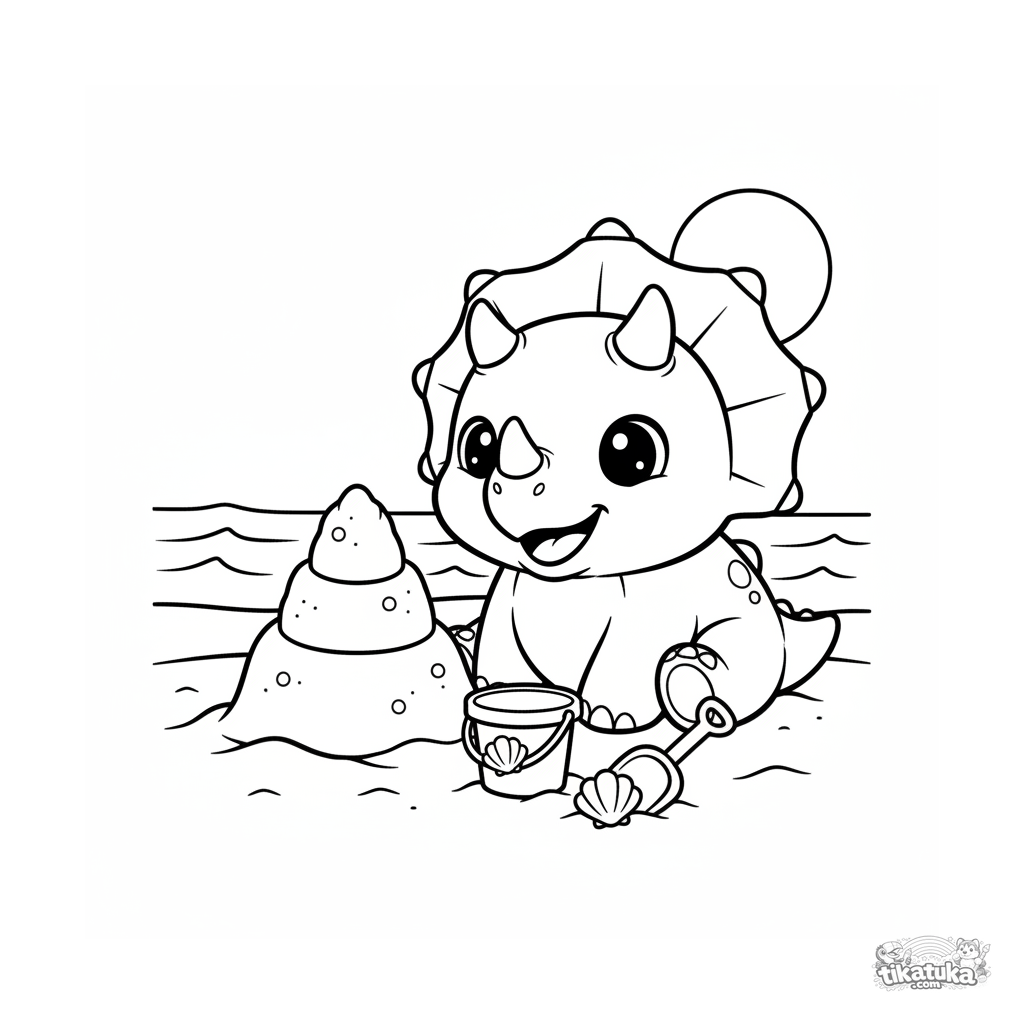 Раскраска для малышей 2-3 года: милый плюшевый трицератопс сидит у песочного замка на древнем пляже. Огромные простые формы, очень толстые контуры, почти нет фона.