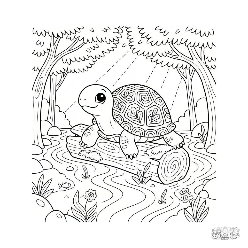 Раскраска для детей 4-6 лет в стиле народного лубка: черепашка удобно устроилась на затопленном бревне в ручье, греясь в солнечном луче. Яркие декоративные формы.