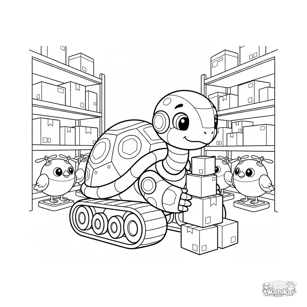 Раскраска для детей 4-6 лет: милый робот-черепаха сортирует коробки на складе среди полок и дронов. Простые формы, дружелюбный персонаж.