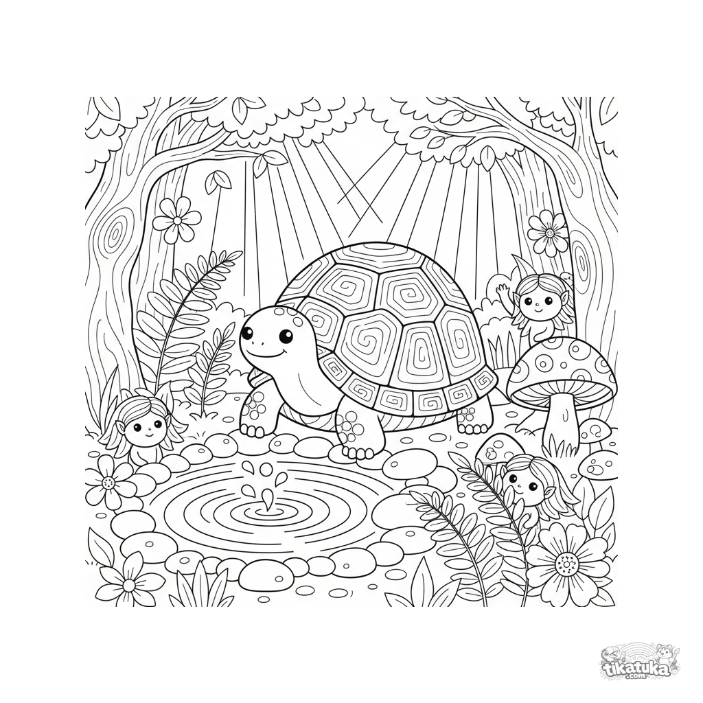 Раскраска для детей 3-6 лет: мудрая черепаха охраняет волшебный родник в древнем лесу. Крупные простые формы, дружелюбный персонаж для первых раскрасок.