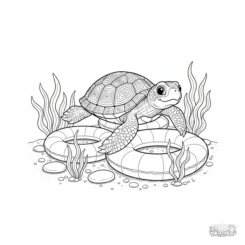Детальная раскраска для детей 10-12 лет: черепаха плывет через надувные кольца на дне бассейна. Сцена с движением и текстурой для увлеченного раскрашивания.