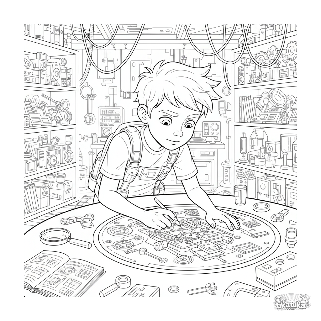 Сложная раскраска для детей 10-12 лет: подросток работает с голографическим чертежом машины в секретной лаборатории изобретателя. Много деталей и технологических элементов.
