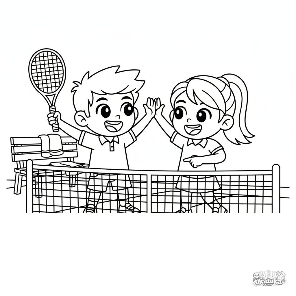 Раскраска для детей 7-9 лет: парная игра в теннис, момент радостного празднования выигранного очка. Динамичная сцена с двумя персонажами и деталями корта.