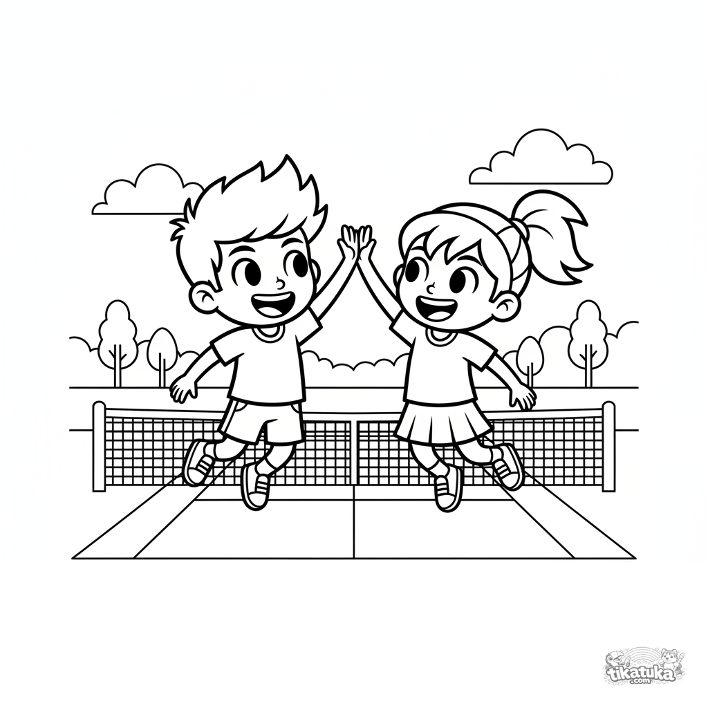 Раскраска для детей 7-9 лет: парная команда теннисистов празднует выигранное очко на корте. Динамичная сцена с эмоциями и деталями для младших школьников.