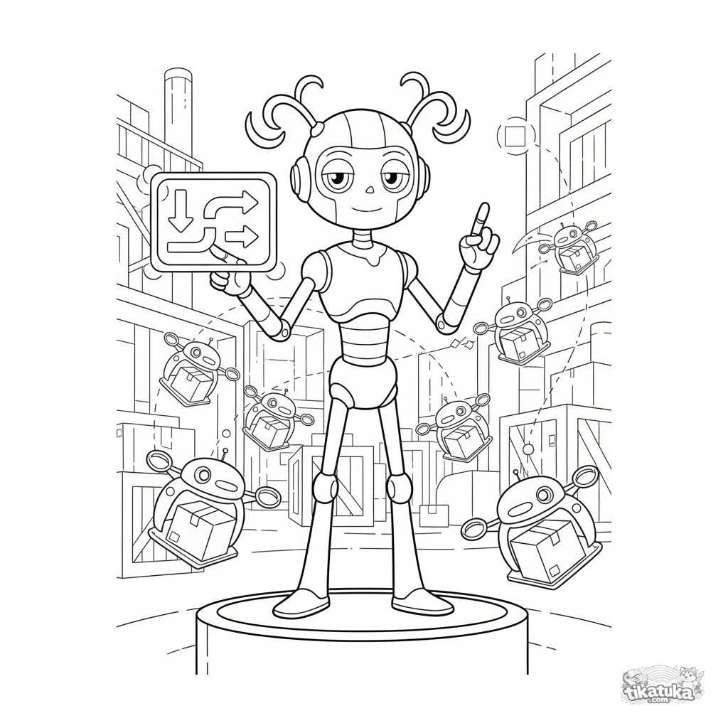 Раскраска с роботом-надзирателем, управляющим дронами с голографического экрана на складе. Для детей 7-9 лет. Динамичная сцена в стиле аниме.