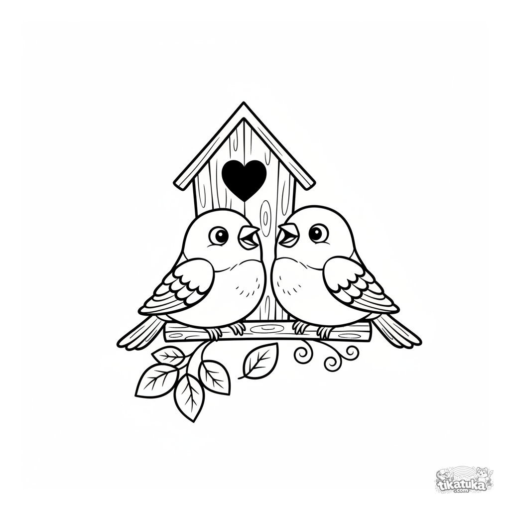Раскраска для детей 4-6 лет в народном стиле: две птички-зяблики сидят на жёрдочке скворечника и общаются. Яркие декоративные формы, простые контуры.