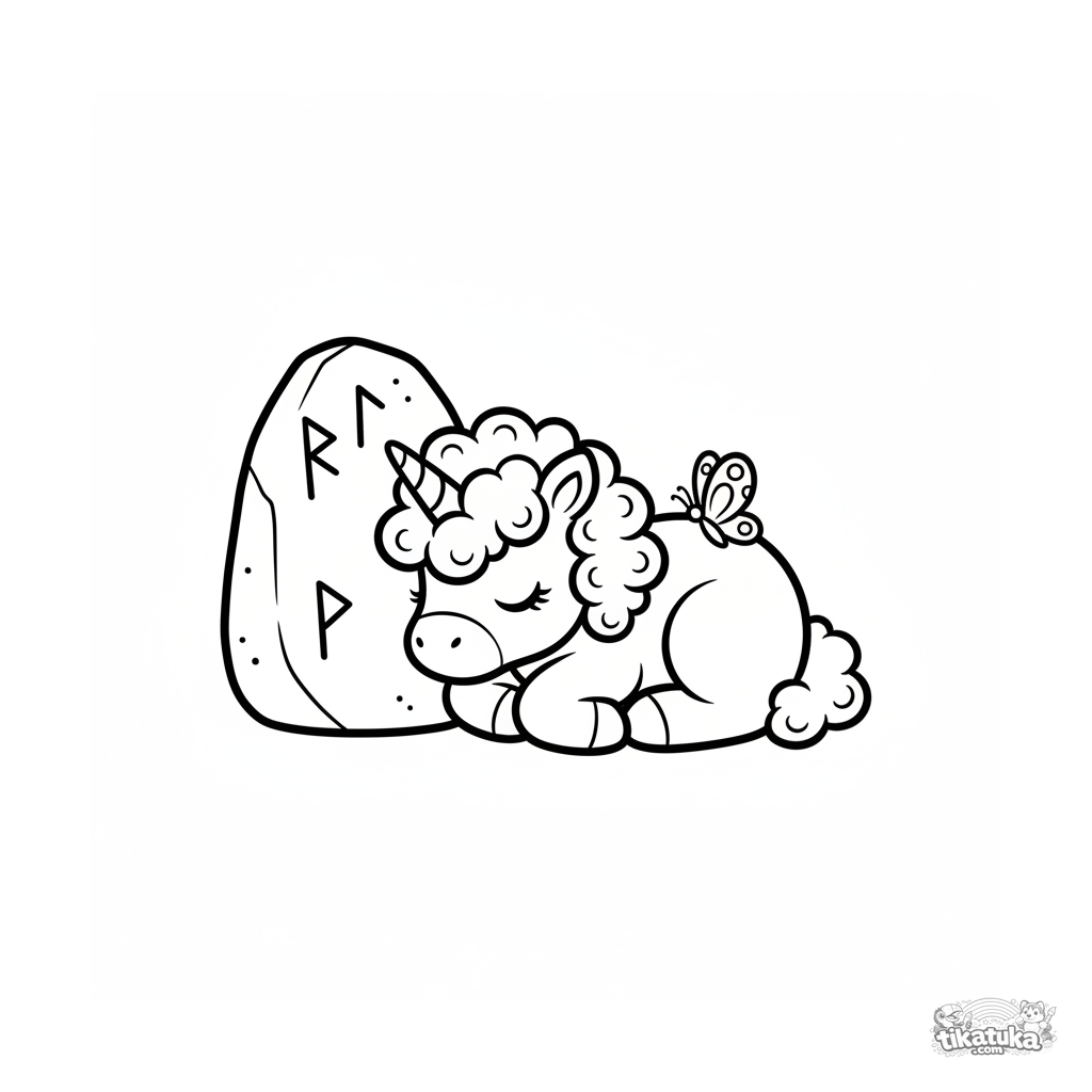Простая раскраска для самых маленьких: плюшевый единорожек сладко спит, прижавшись к древнему руническому камню. Очень крупные, понятные формы.