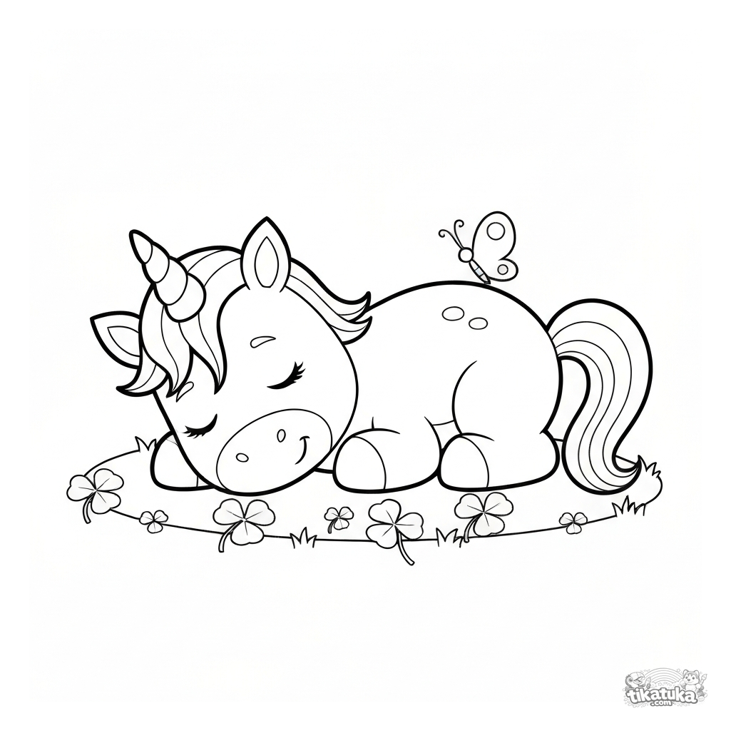 Раскраска для самых маленьких: жеребенок единорога сладко спит на мягком клевере. Очень простой рисунок с минимумом деталей для детей 2-4 лет.