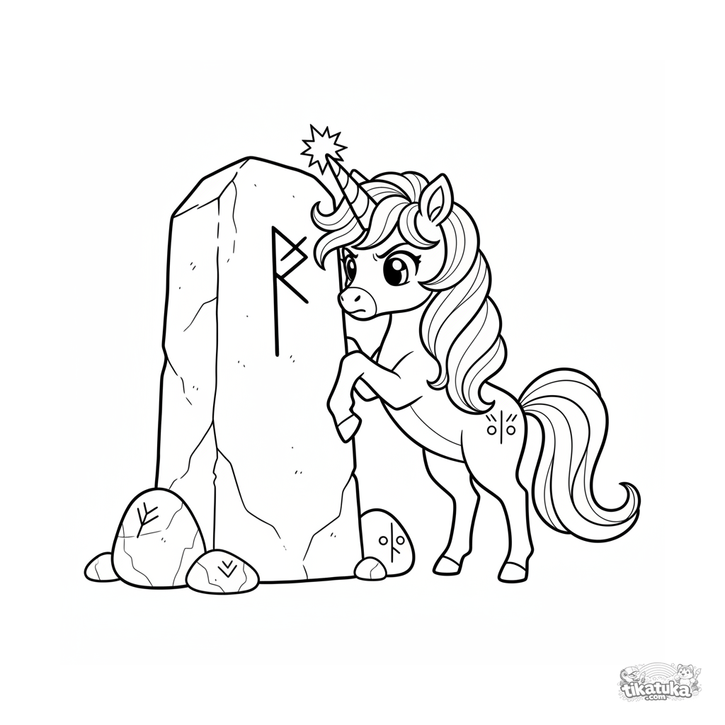 Раскраска для детей 7-9 лет: юный единорог с помощью рога изучает древние руны на монолите. Динамичная поза, детализированный фон.