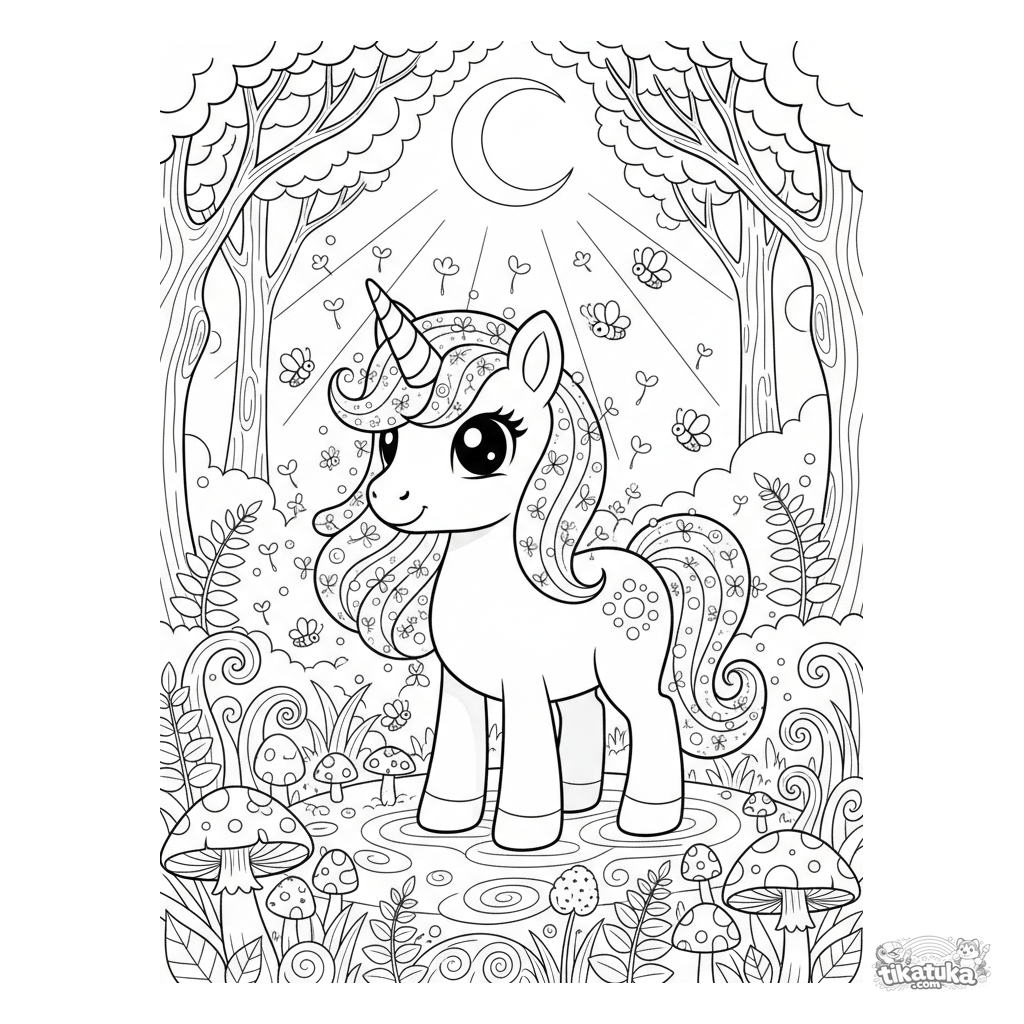 Сложная раскраска для девочек 7-12 лет. Волшебный пони-единорог со светящейся гривой из семян одуванчика в лунной лесной поляне.