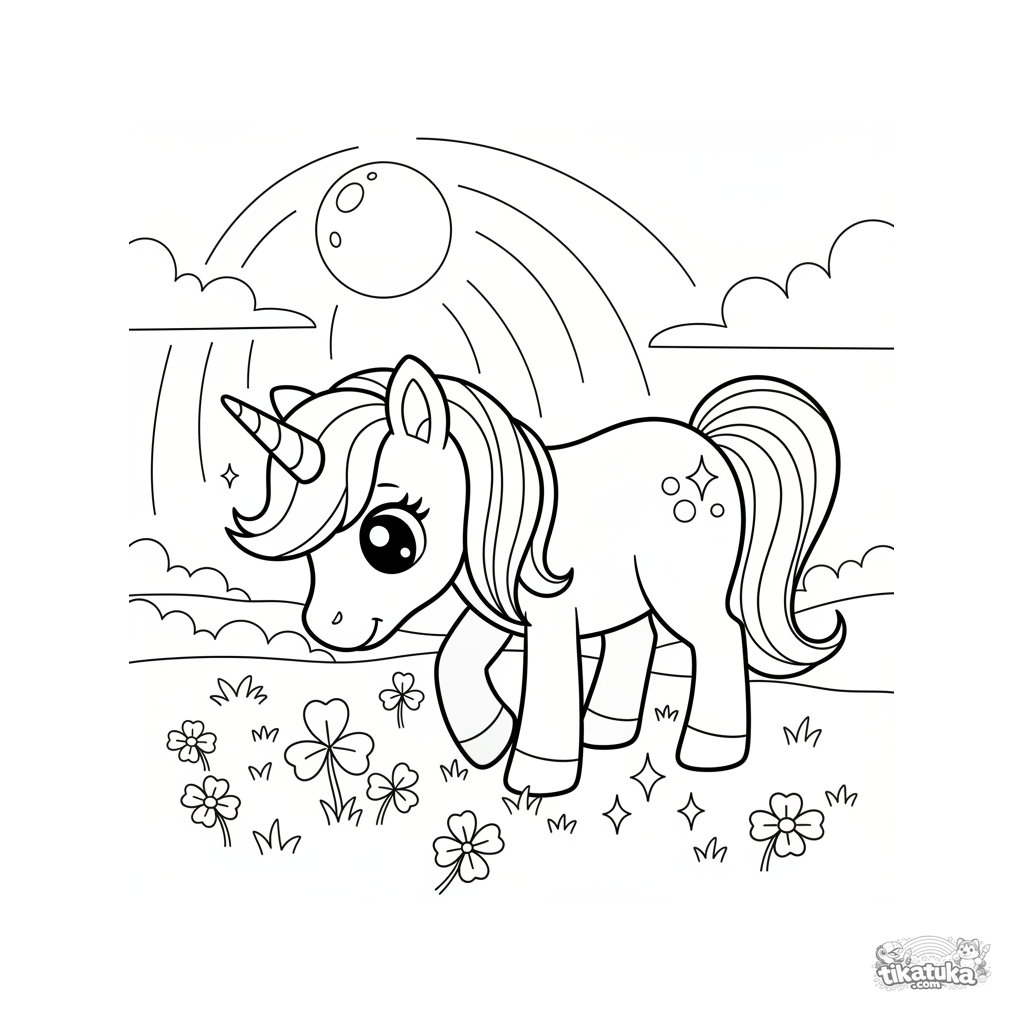 Раскраска для девочек 5-7 лет: волшебный пони-единорог пасется на цветущем лугу при лунном свете. Средний уровень детализации.