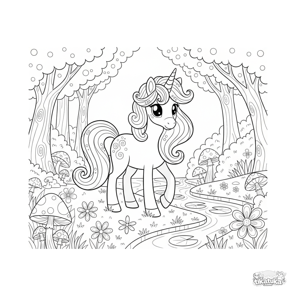 Раскраска волшебного пони-единорога с кристальным рогом в зачарованной роще. Для детей 6-9 лет. Светящиеся грибы, звездчатые цветы и ручей.