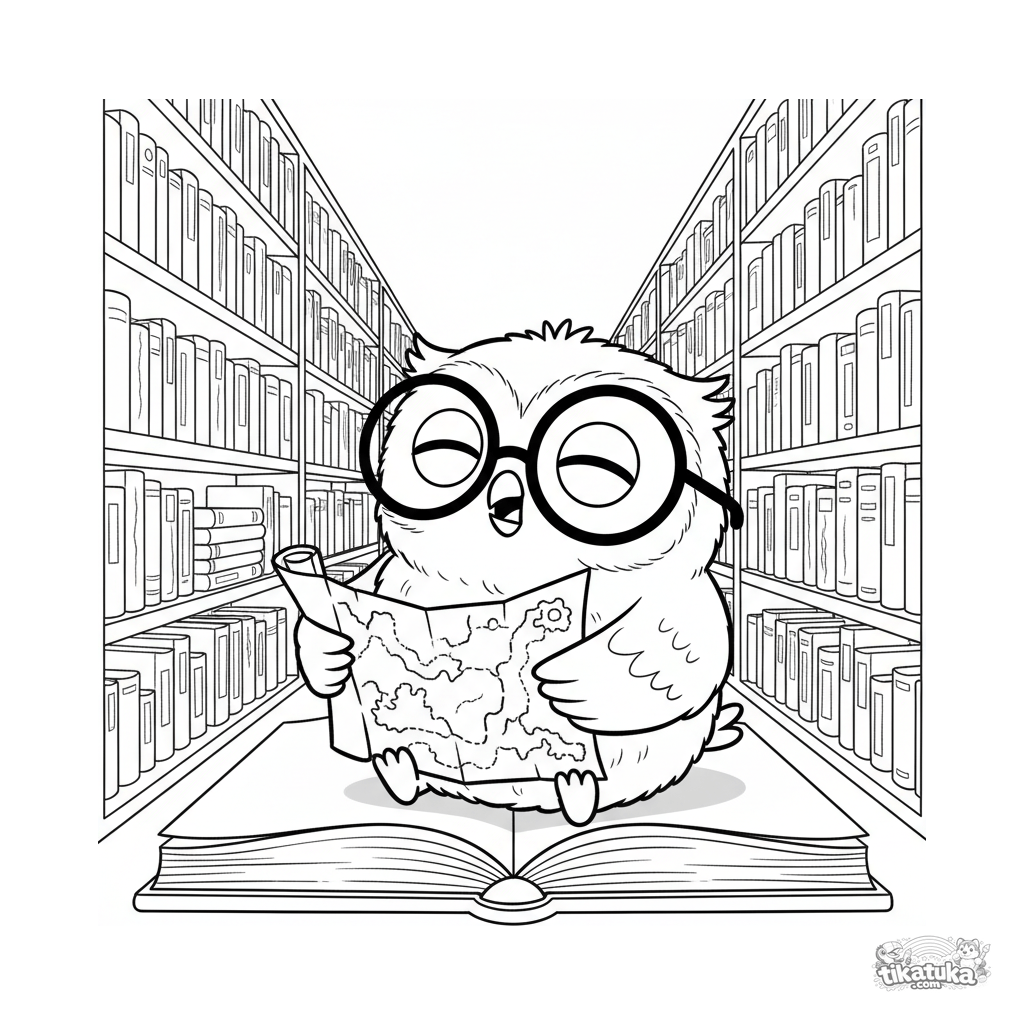 Совёнок Уф на огромной книге среди бесконечных полок, держа карту и выглядя ошеломленным. Скачайте, распечатайте или раскрасьте онлайн!