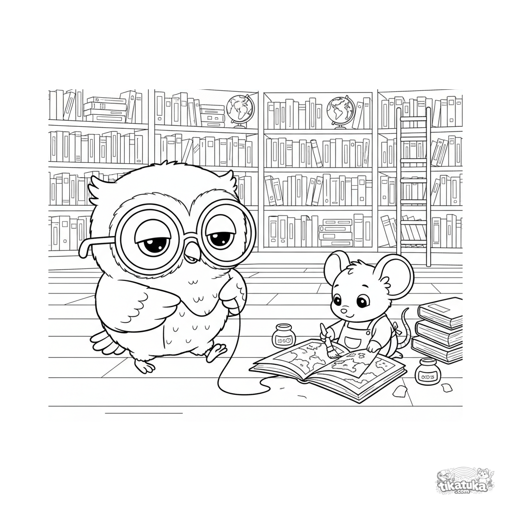 Забавный совёнок Уф в библиотеке следует за красной нитью, ведущей к мышке, клеящей атлас. Скачайте, распечатайте или раскрасьте онлайн!
