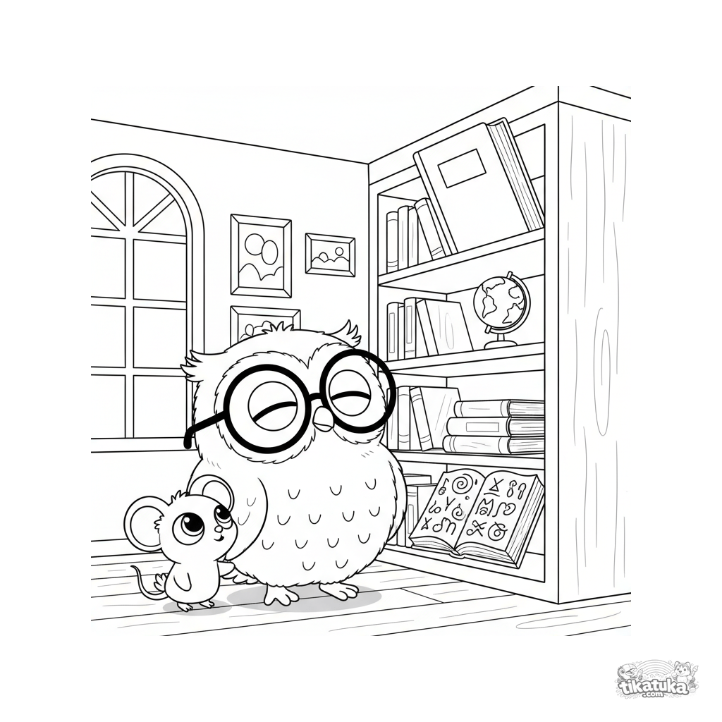 Раскраска: Совёнок и Мышонок в библиотеке перед новой преградой – книгой на высокой полке и таинственными символами. Скачайте или раскрасьте онлайн!