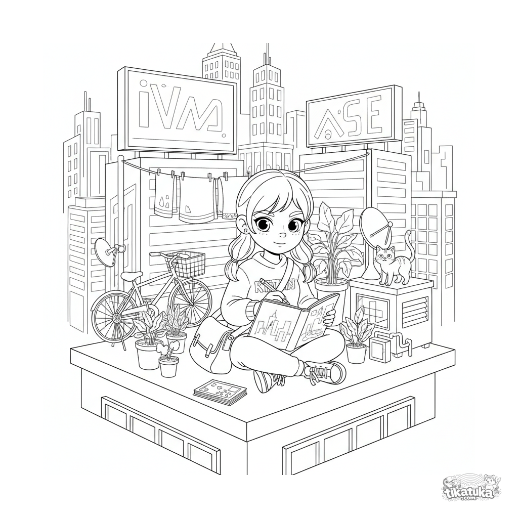 Раскраска в урбан-аниме стиле: девушка рисует неоновый городской пейзаж с крыши в сумерках. Сложная сцена с деталями городской жизни — растения, велосипед, кошка, для детей 10-12 лет.