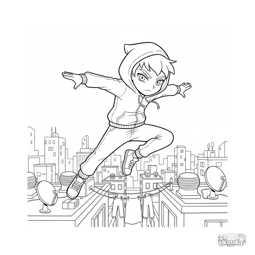 Динамичная раскраска в стиле экшен-манги: современный ниндзя совершает прыжок паркура между крышами на закате. Для детей 10-12 лет, с детализированным городским фоном, антеннами и вентиляционными блоками.
