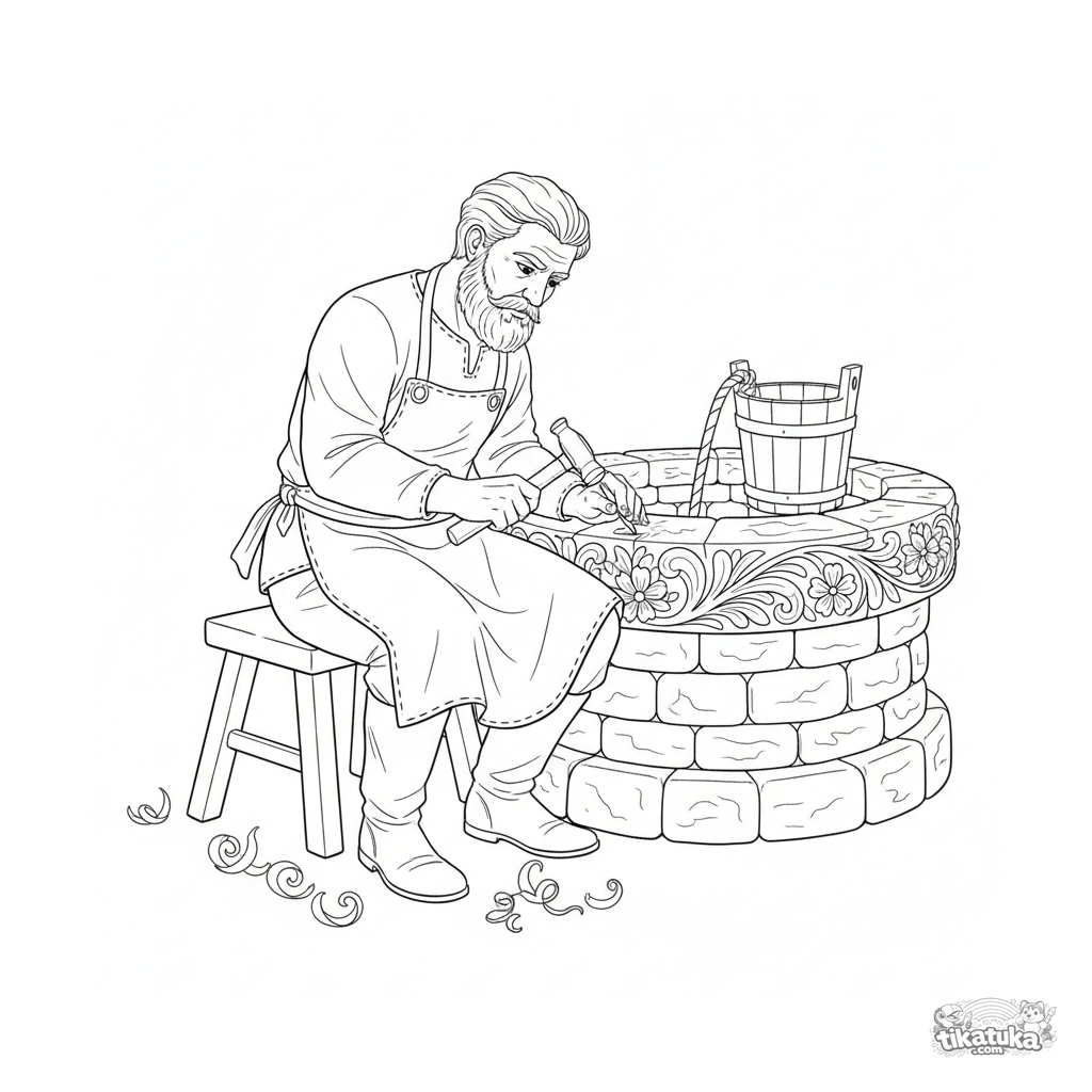 Детализированная раскраска для детей 10-12 лет: деревенский мастер вырезает узор на колодце с живой водой. Реалистичное изображение инструментов и процесса резьбы.