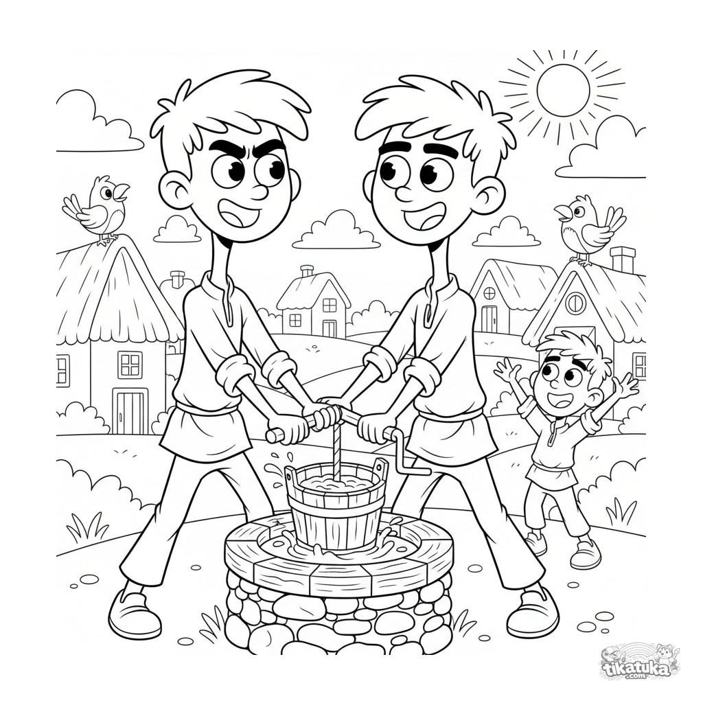 Раскраска для детей 7-9 лет: деревенские мальчишки соревнуются, кто быстрее поднимет ведро с живой водой из колодца. Динамичная фольклорная сцена с друзьями.