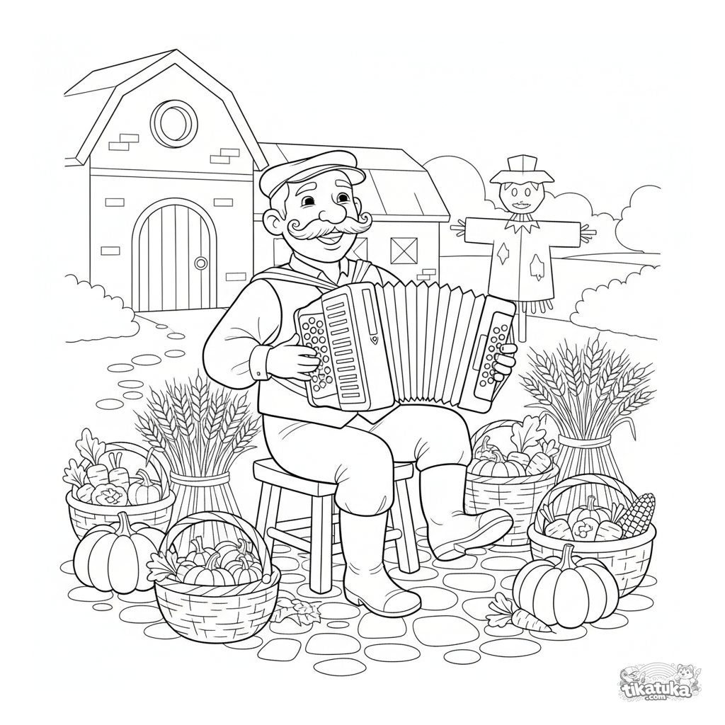 Раскраска для детей: весёлый деревенский музыкант играет на гармони во дворе во время сбора урожая. Бесплатная страница для печати, подходит для возраста 4-6 лет.