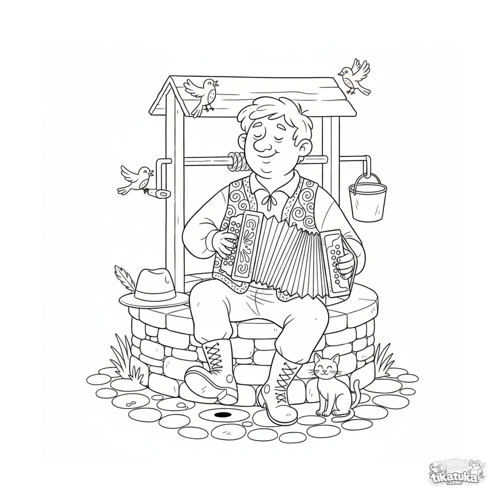Раскраска для детей 10-12 лет: деревенский музыкант играет на гармони у колодца. Детализированное изображение в стиле научного рисунка, много текстур.