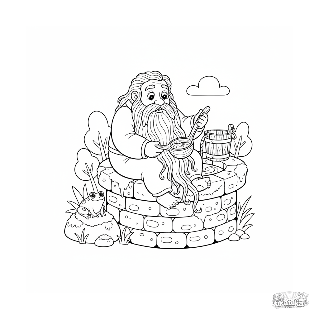 Раскраска для детей 4-6 лет: добрый водяной дух у колодца с живой водой. Русский фольклорный сюжет с лягушкой и деревянным ведром.