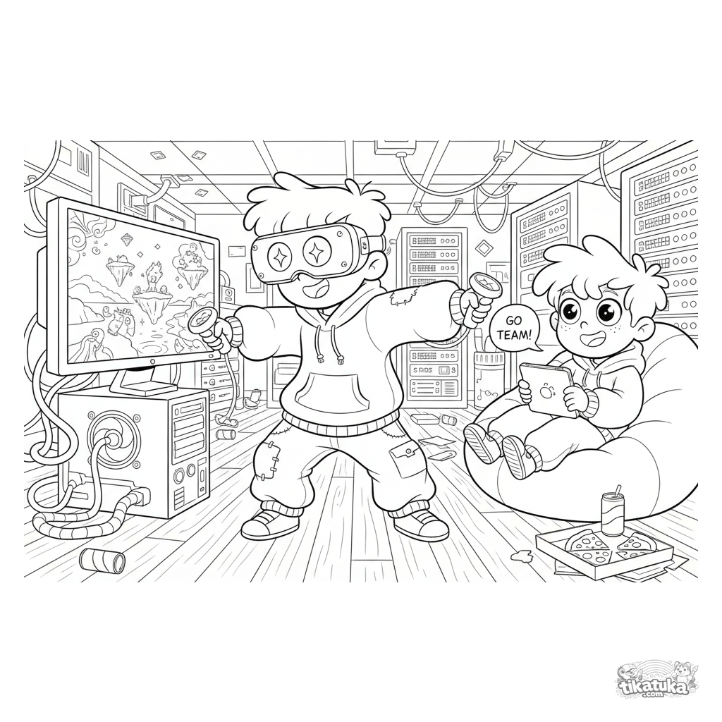 Раскраска про VR: геймер в шлеме виртуальной реальности играет в подвале хакеров. Сцена с монитором, проводами и наблюдающим другом.