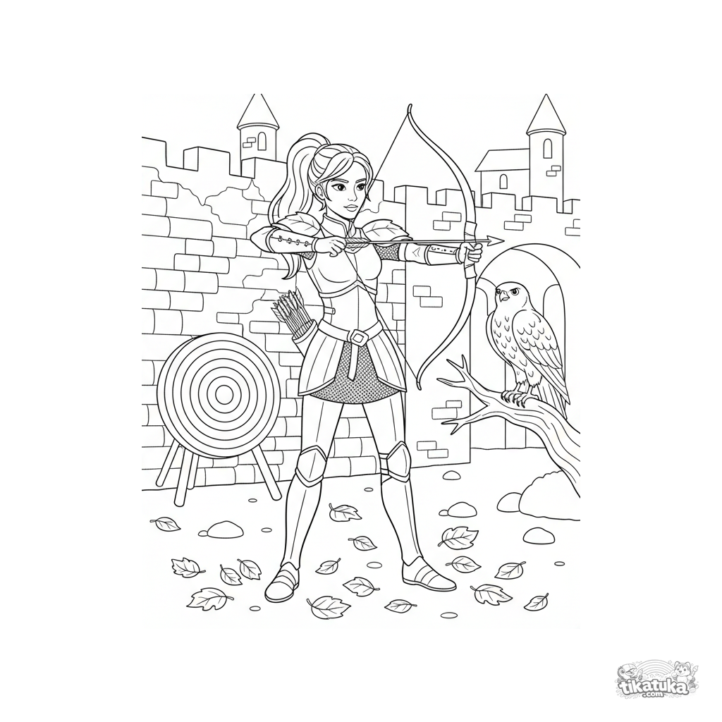 Раскраска для детей 7-9 лет: воинственная принцесса тренируется в стрельбе из лука в осеннем дворе. Четкие контуры, умеренная детализация.