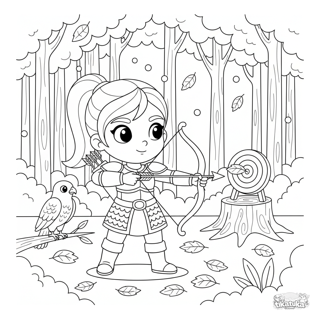 Раскраска для детей 7-9 лет: воин-принцесса в доспехах тренируется в стрельбе из лука в осеннем лесу, с ястребом на ветке и мишенью на пне.