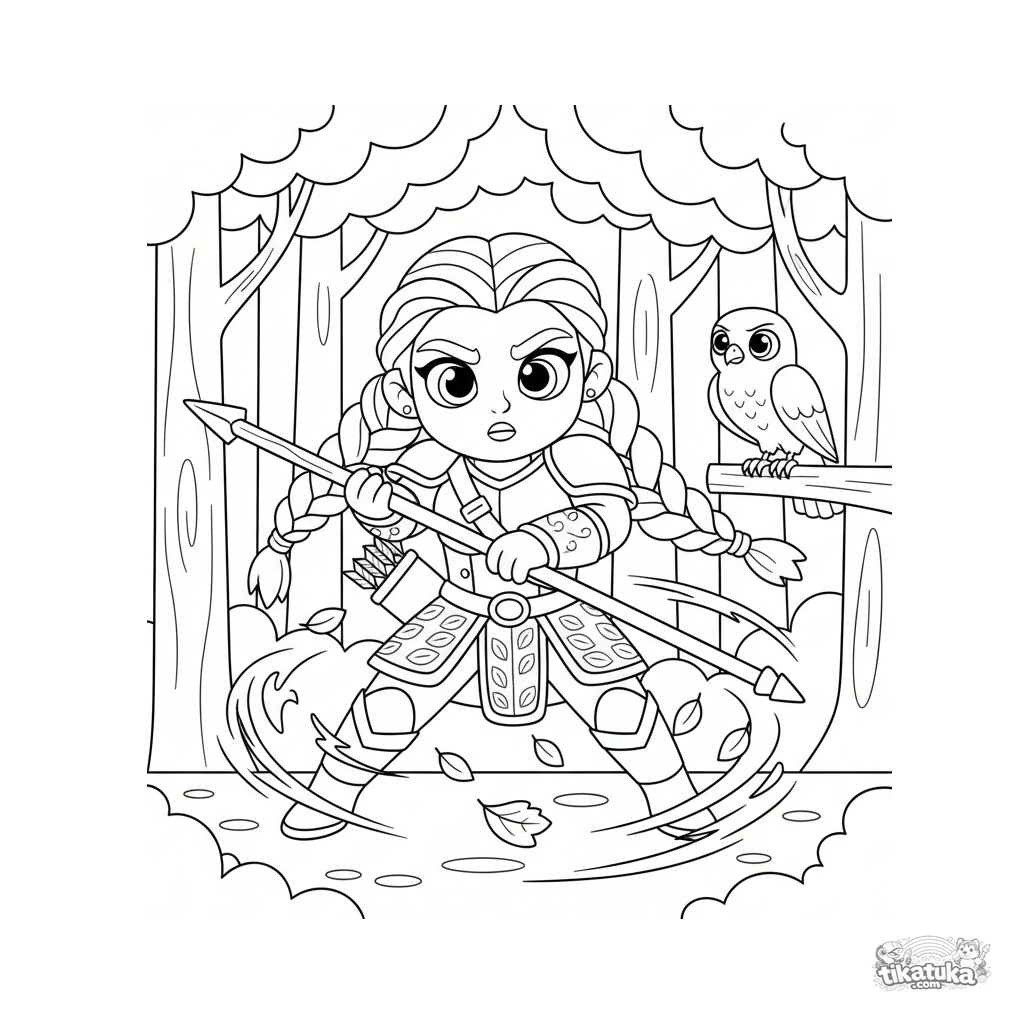 Раскраска для детей 7-9 лет: воинственная принцесса тренируется с посохом в осеннем лесу. Динамичная поза, осенние листья, детали доспехов.