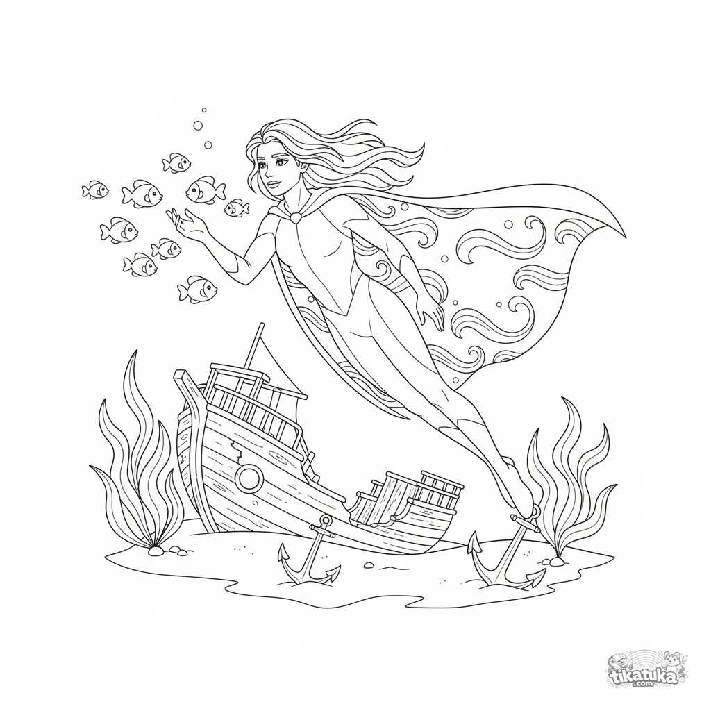 Раскраска для детей 7-9 лет: водный супергерой плавает среди кораллов у затонувшего корабля, общаясь с рыбками. Спокойная подводная сцена для раскрашивания.