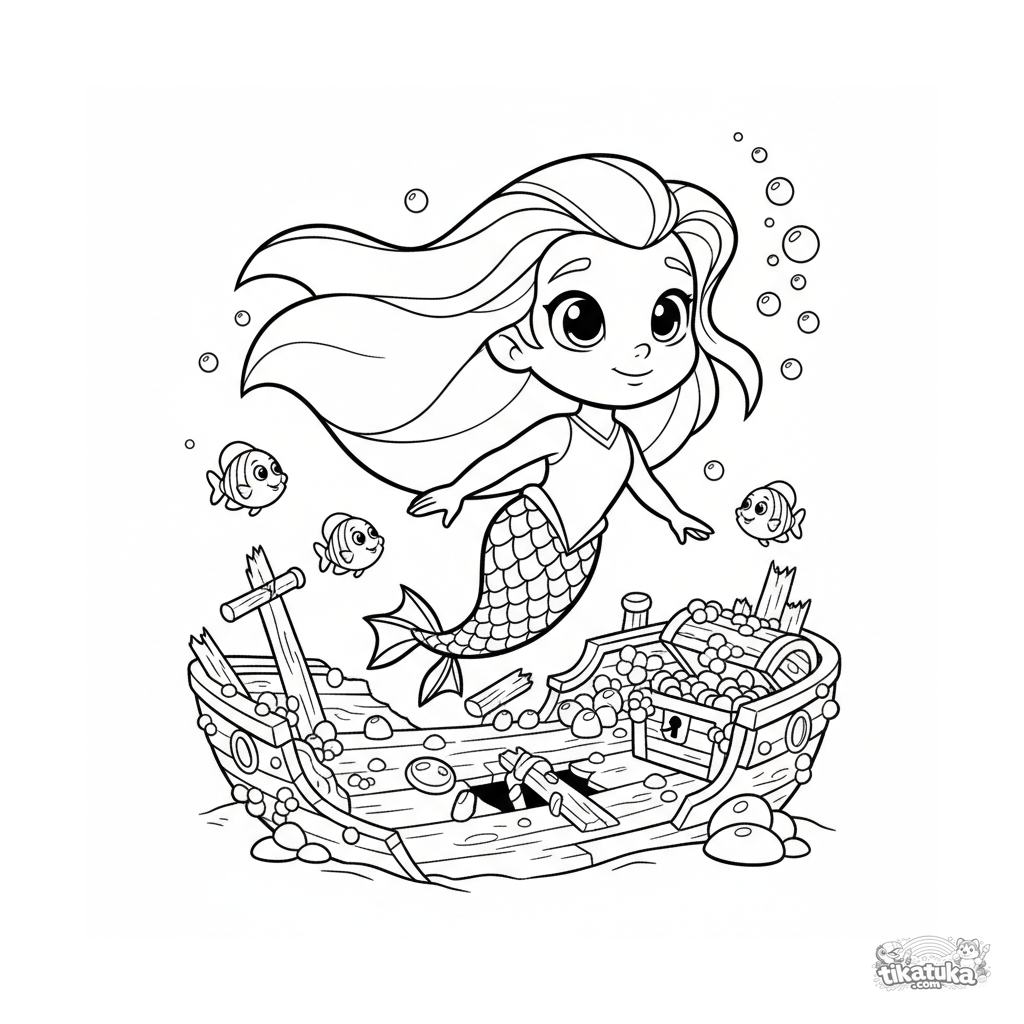 Раскраска для детей 4-6 лет: водный супергерой в костюме с чешуйками исследует затонувший корабль среди рыб и сокровищ. Подводное приключение.