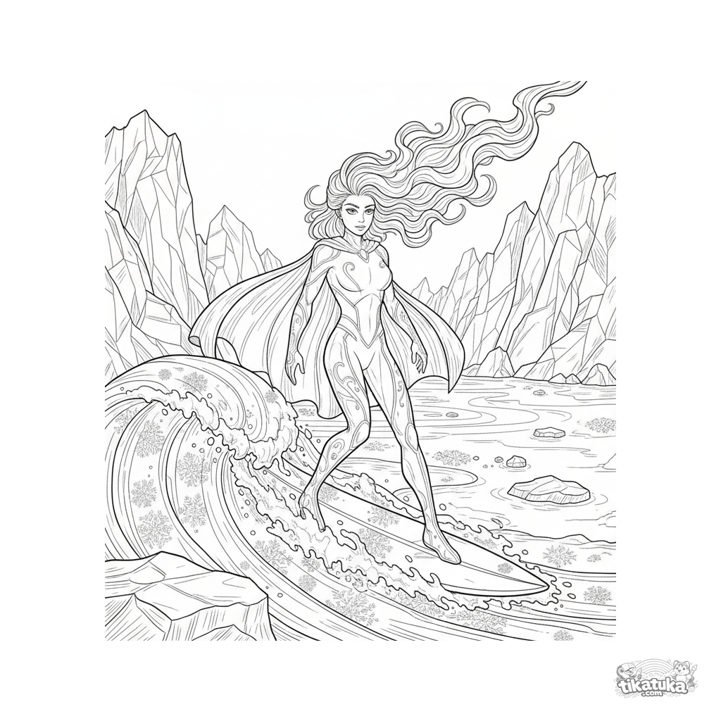 Сложная раскраска для 10-12 лет: супергерой воды и льда скользит по замёрзшему озеру в Арктике, оставляя за собой узоры из инея.