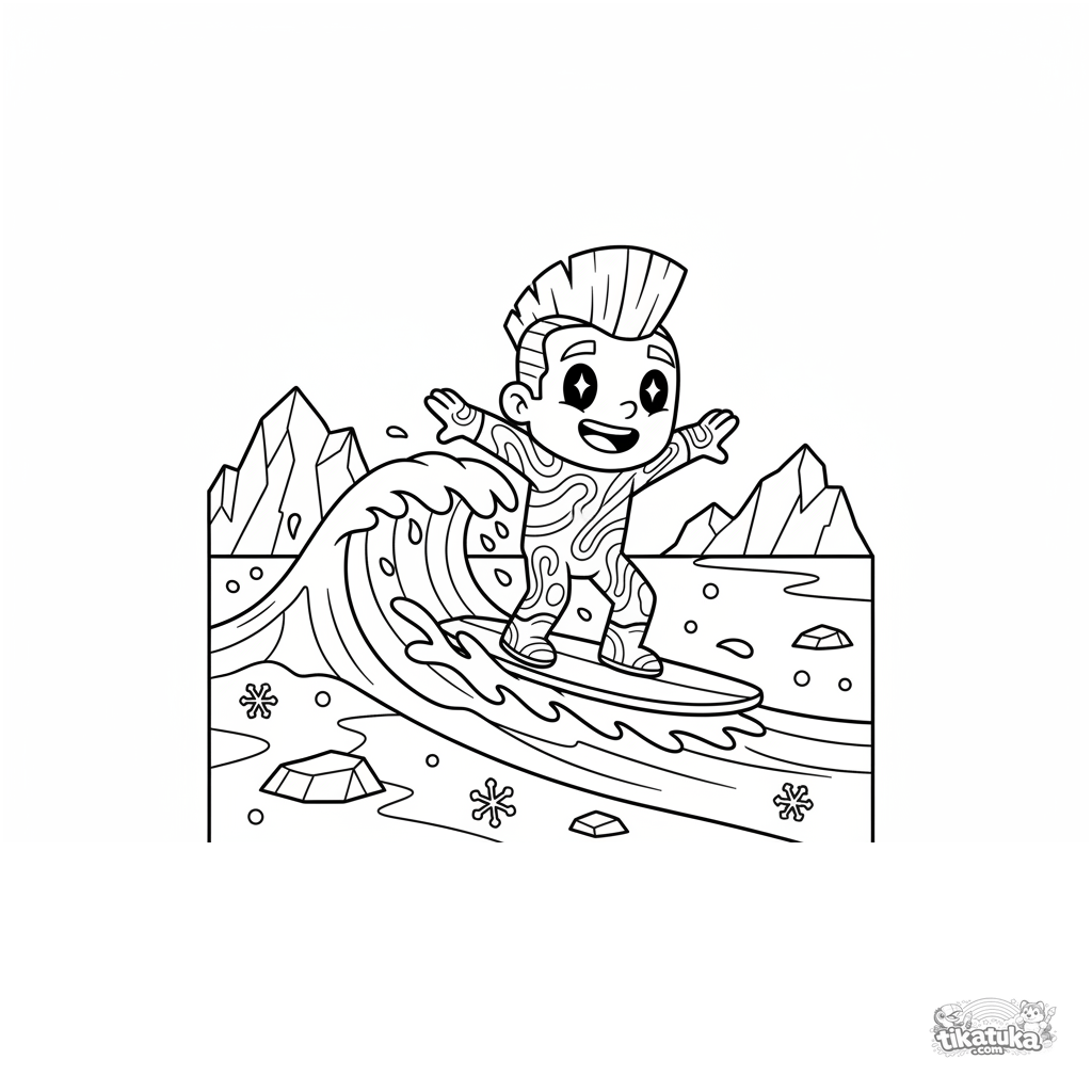 Раскраска для детей 7-9 лет: супергерой с силами воды катается на волне посреди замёрзшего арктического озера, радостное выражение лица.