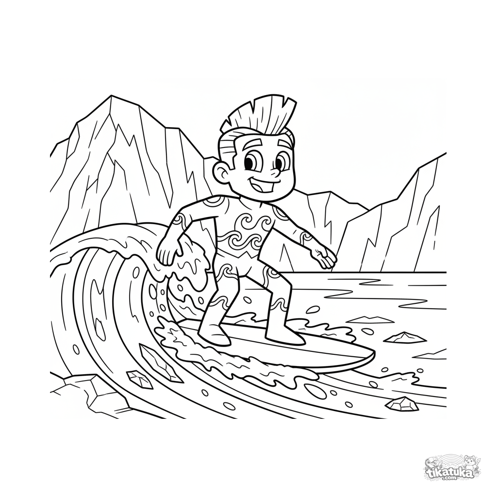 Раскраска для детей 4-6 лет: водный супергерой в синем костюме катается на ледяной волне по замерзшему озеру у ледника. Веселая динамичная сцена.