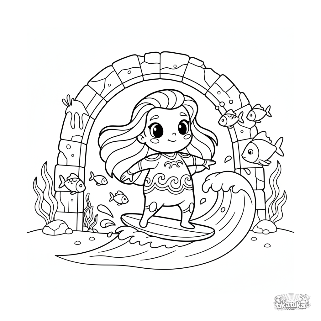 Раскраска для детей 4-6 лет: водный супергерой в костюме с волнами катается на волне среди древних подводных каменных арок, вокруг плавают рыбки.