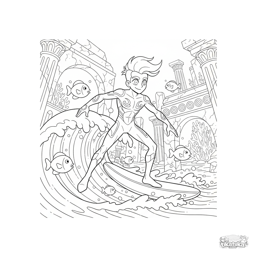 Раскраска для детей 10-12 лет: супергерой, управляющий водой, скользит на волне среди арок и колонн затонувшего древнего города, окружённый рыбами.