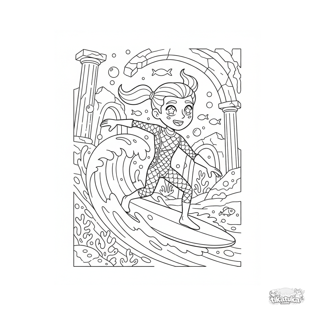 Раскраска для детей 4-6 лет: супергерой с водными силами катается на волне у древних подводных руин. Весёлая сцена в стиле мультфильмов 90-х.